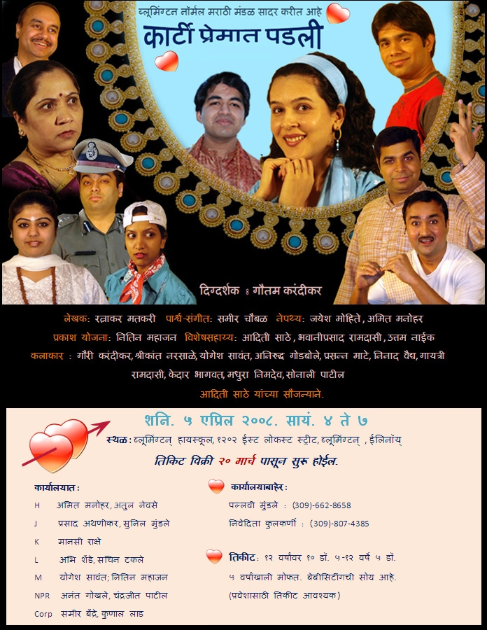 गुढीपाडवा! ब्लुमिंग्टन नॉर्मल मधील मराठी जाणकार रहिवासियांना गुढीपाडवा या सणाचे सांस्कृतिक आकर्षण म्हणजे मराठी मंडळातर्फे होणारे तीन अंकी मराठी नाटक। गेल्या ८ वर्षांची प्रथा याही वर्षी चालू राहिली। या वर्षीचे नाटक होते रत्नाकर मतकरी लिखित आणि गौतम करंदीकर दिग्दर्शित, 'कार्टी प्रेमात पडली.'